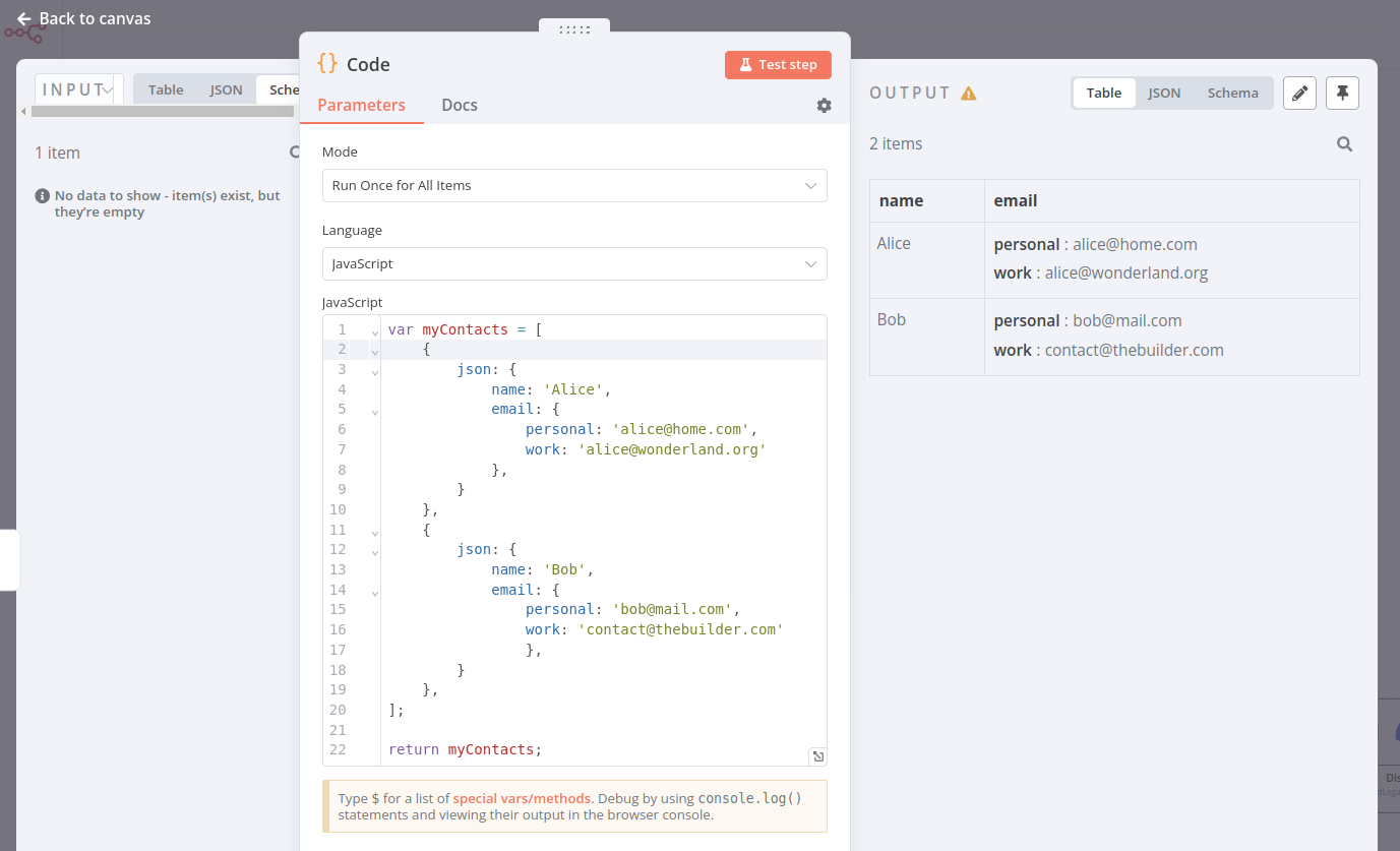 Let's build on the previous exercise, in which you used the Code node to create a data set of two contacts with their names and emails. Now, connect a second Code node to the first one. In the new node, write code to create a new column named workEmail